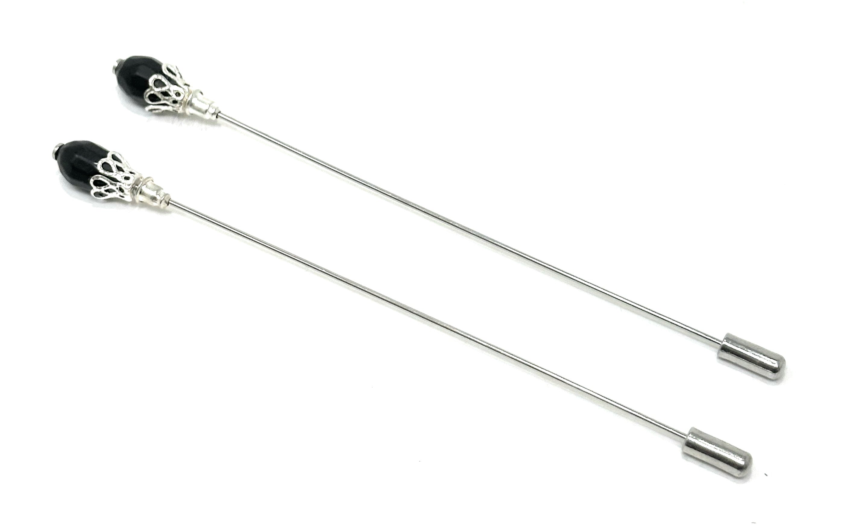Size GuideTimeless Black & Silver Duo for Sophisticated Styling This coordinated set includes two long hat pins, each designed with a glossy black teardrop bead top encased in a silver filigree...