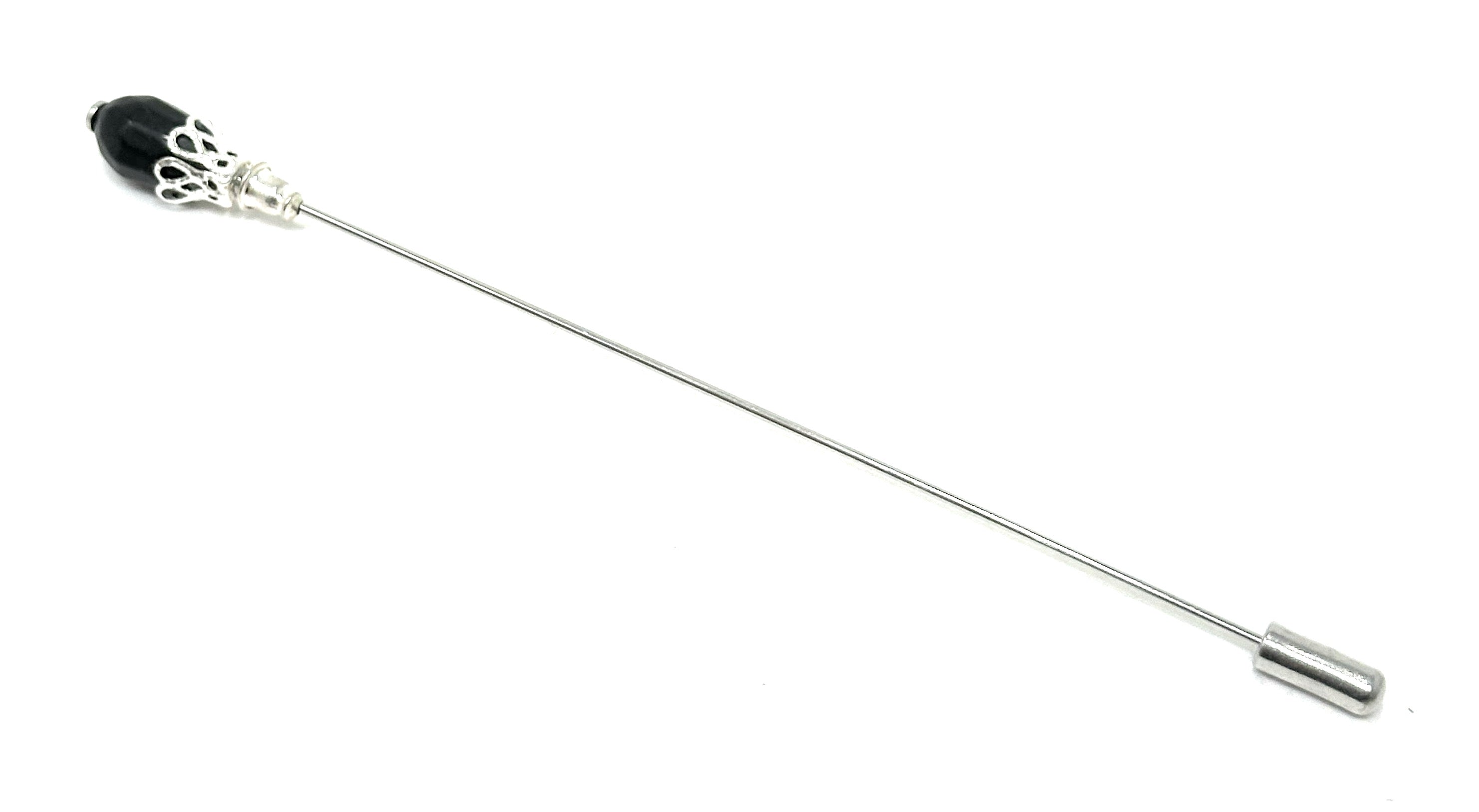 Size GuideAntique-Inspired Styling with Black Bead Accent This elegant long hat pin features a jet-black teardrop bead with a delicately filigreed silver-tone bead cap, adding vintage character to any ensemble. A...