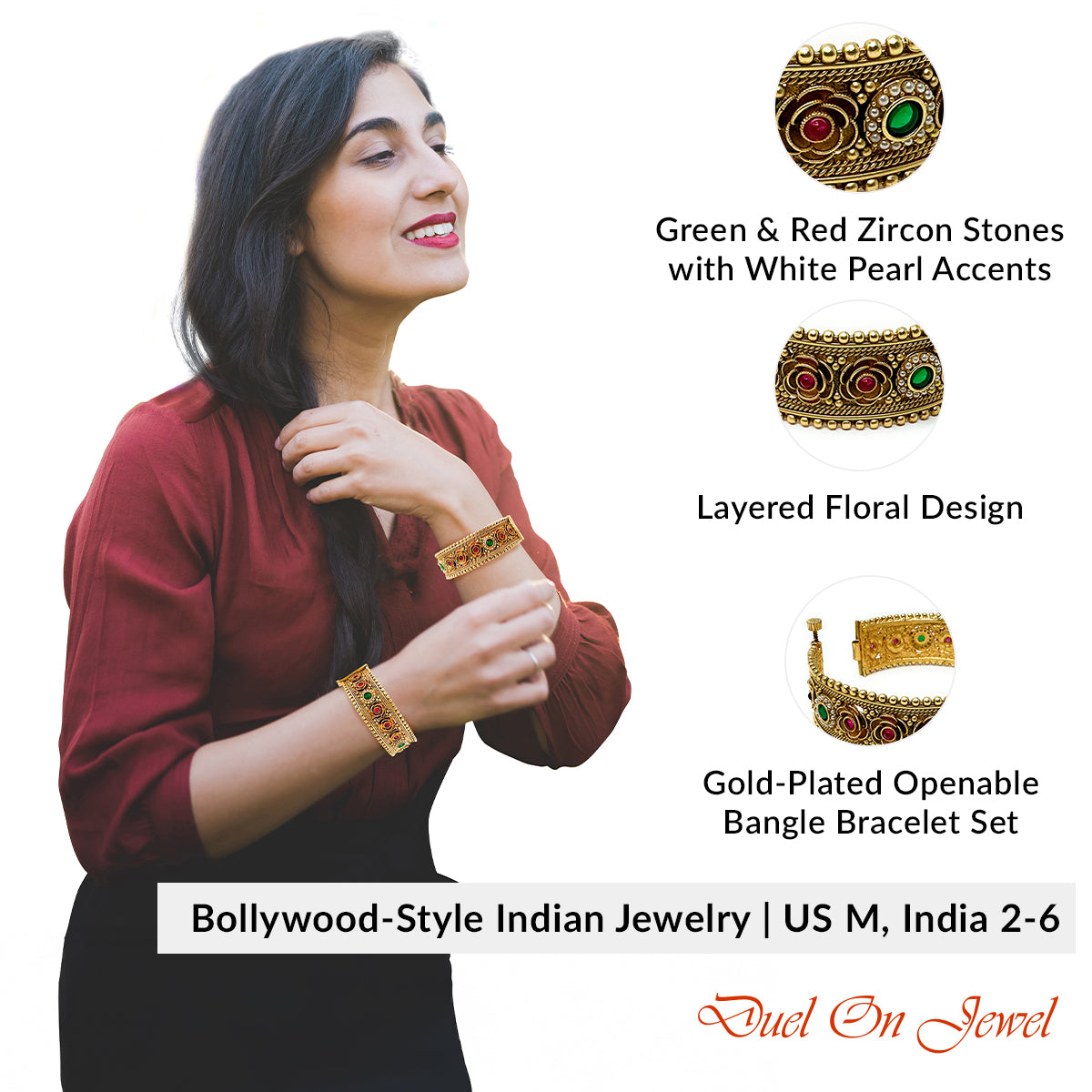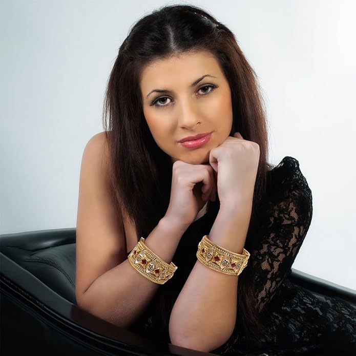 Size GuideThe Traditional Indian Bridal Openable Kada Bangle Set by Duel On Jewel is a vibrant celebration of ethnic artistry. Featuring a 5K gold-plated finish, these wide kadas are adorned with...