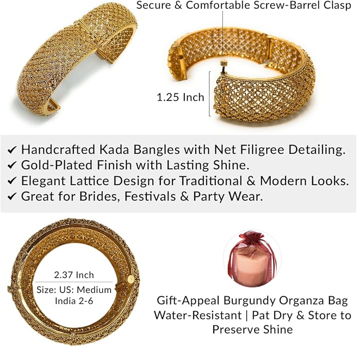 Size GuideThe Ethnic Indian Bridal Openable Kada Bangle Bracelet Set is a masterpiece of delicate metalwork, showcasing the timeless beauty of Jali (net) filigree. Crafted with a 5K gold-plated finish, these...
