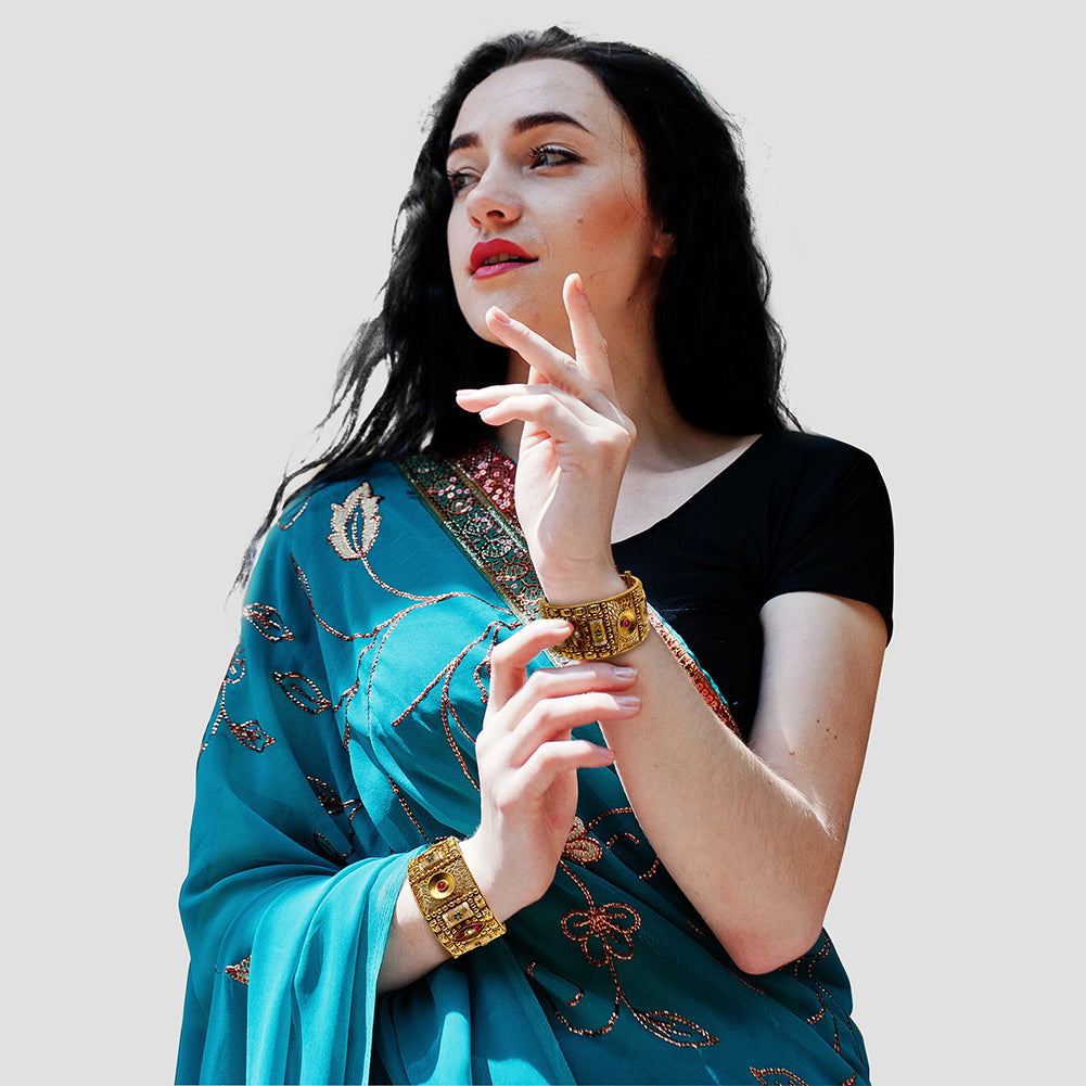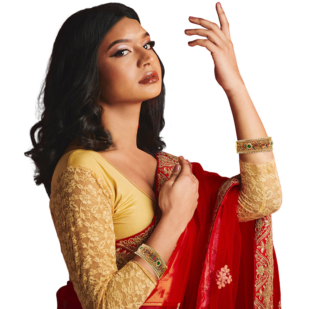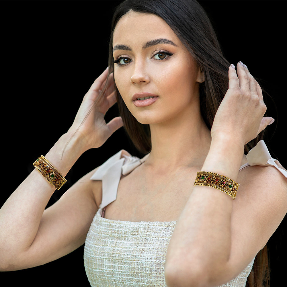Size GuideThe Bollywood-Inspired Floral Kada Bangle Bracelet Set is a radiant celebration of Indian craftsmanship and cinematic glamour. Handcrafted with a 5K gold-plated finish, each bangle features an intricate floral tapestry...