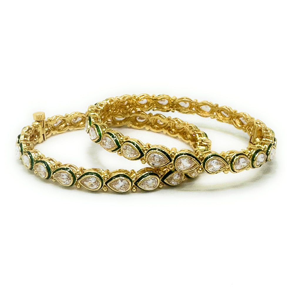 Size GuideDiscover the beauty of heritage craftsmanship and modern minimalism with the Duel On Jewel Teardrop Kundan Bangle Set. Designed for the woman who appreciates refined elegance, these bangles feature a continuous row of teardrop-shaped Kundan stones, each meticulously framed by delicate green enamel accents. Set against a sleek gold-plated base, this pair offers a sophisticated "Antique Chic" look that transitions seamlessly from bridal luxury to evening glamour.
