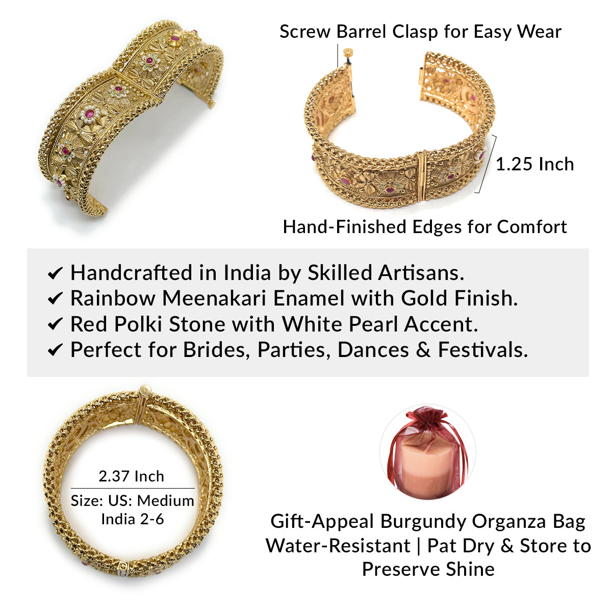 This versatile pair transitions effortlessly from grand wedding attire to modern fusion styling. Whether showcased as standalone statement cuffs or stacked with traditional gold bangles, the Polki stones and rainbow Meenakari impart a timeless quality that transcends fleeting trends. Perfect for Mehndi nights, Diwali, Eid, or red-carpet events.