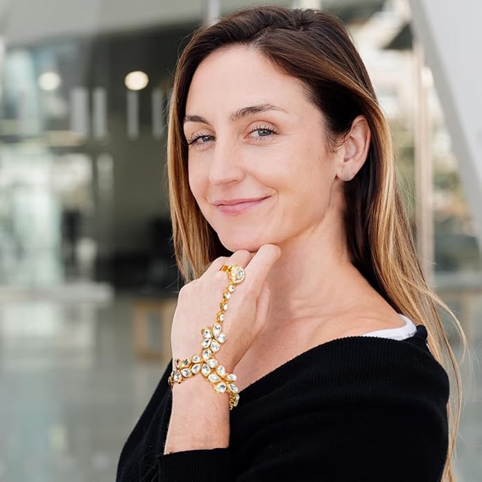 Size GuideCelebrate the fusion of art, culture, and fashion with Duel On Jewel’s Gold-Plated Kundan Haath Phool. This elegant hand ornament features radiant glass stones set in the classic Kundan style—a...
