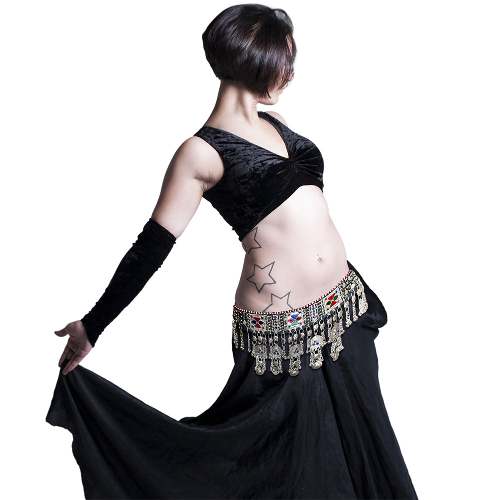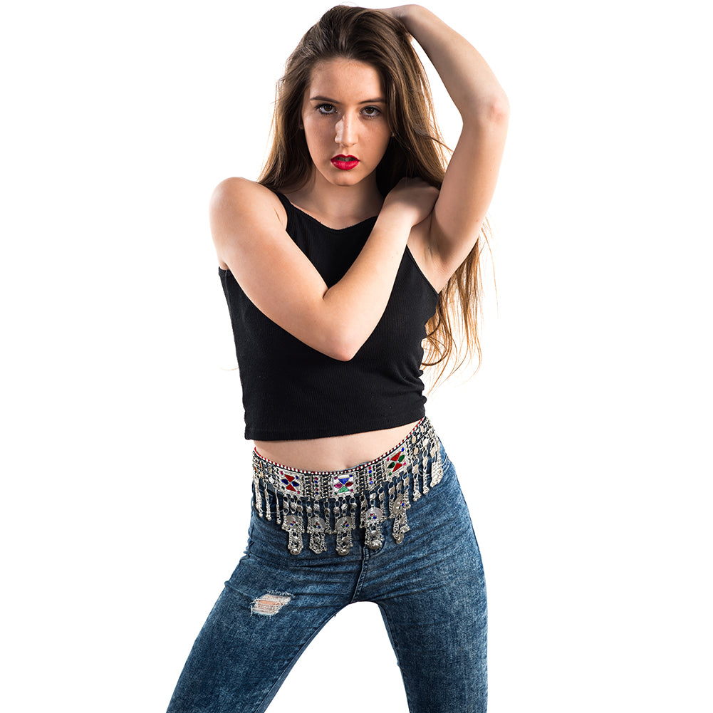 Size GuideThe Afghan Baloch Tribal Waist Belt features a stunning 5.5-inch wide embellished center adorned with traditional coins, multicolor beads, and loud jingling bells. Handcrafted by skilled artisans to reflect the...